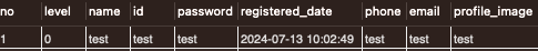 insert into `user` (no, level, name, id, password, registered_date,phone,email,profile_image)