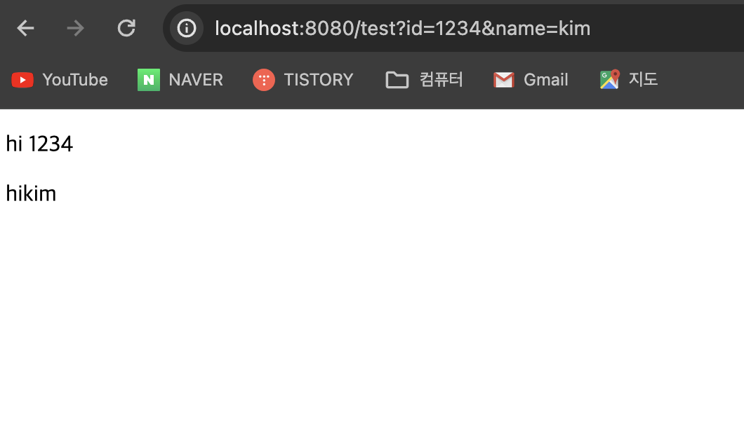 localhost8080/test?id=test1234&name=kim 이라고 클라이언트가 다음과 같이 서버에 요청한다고 하자